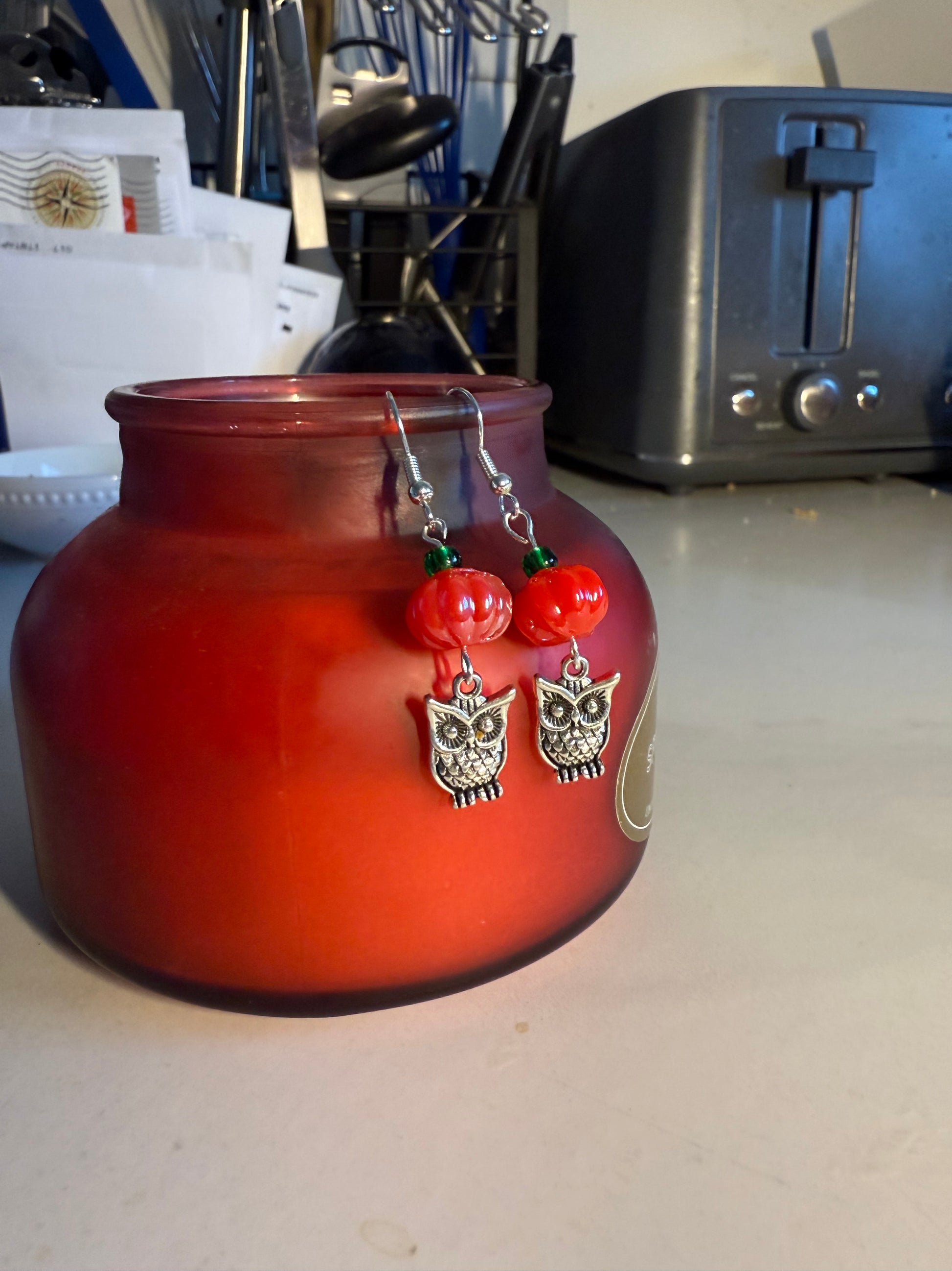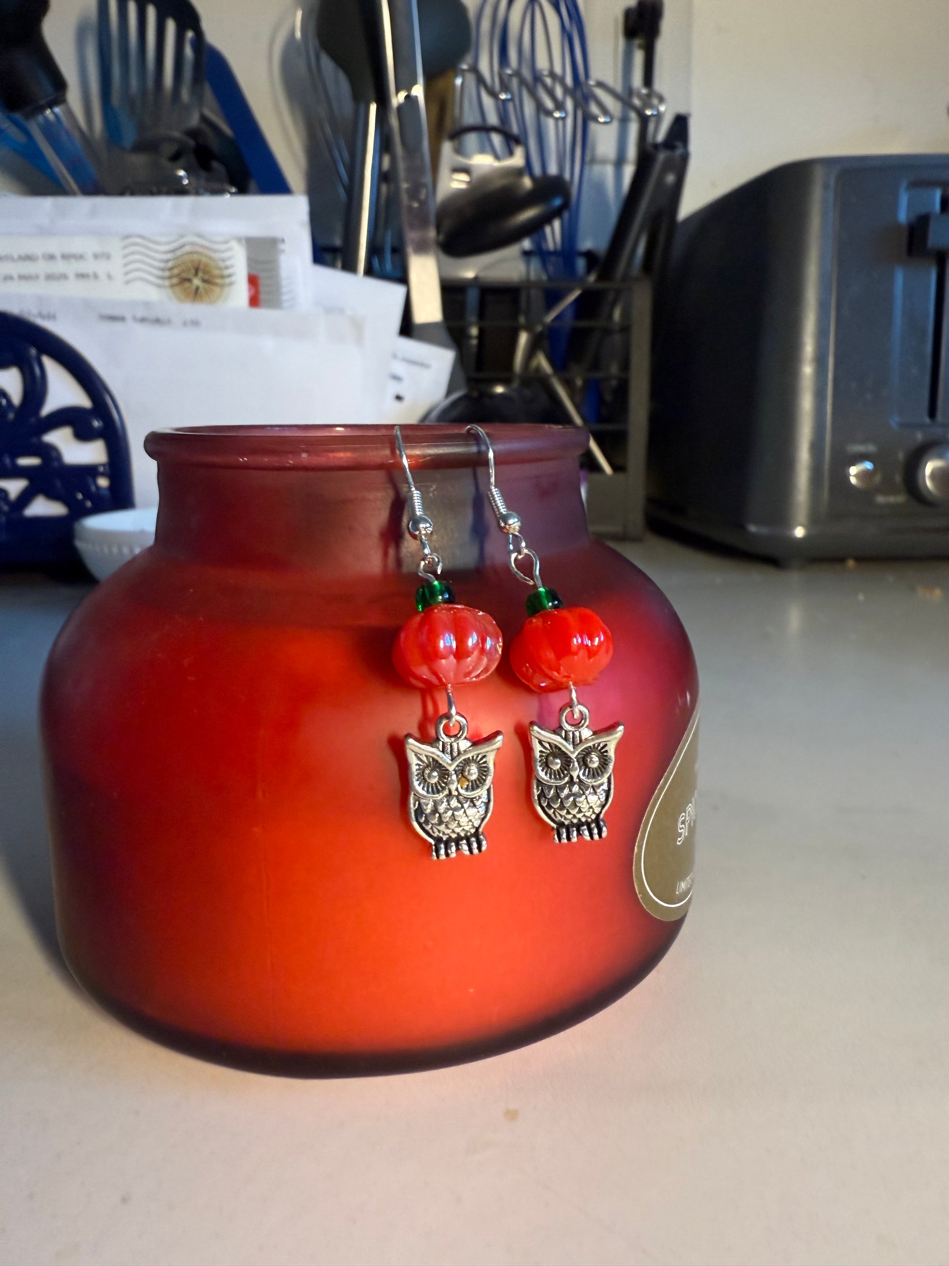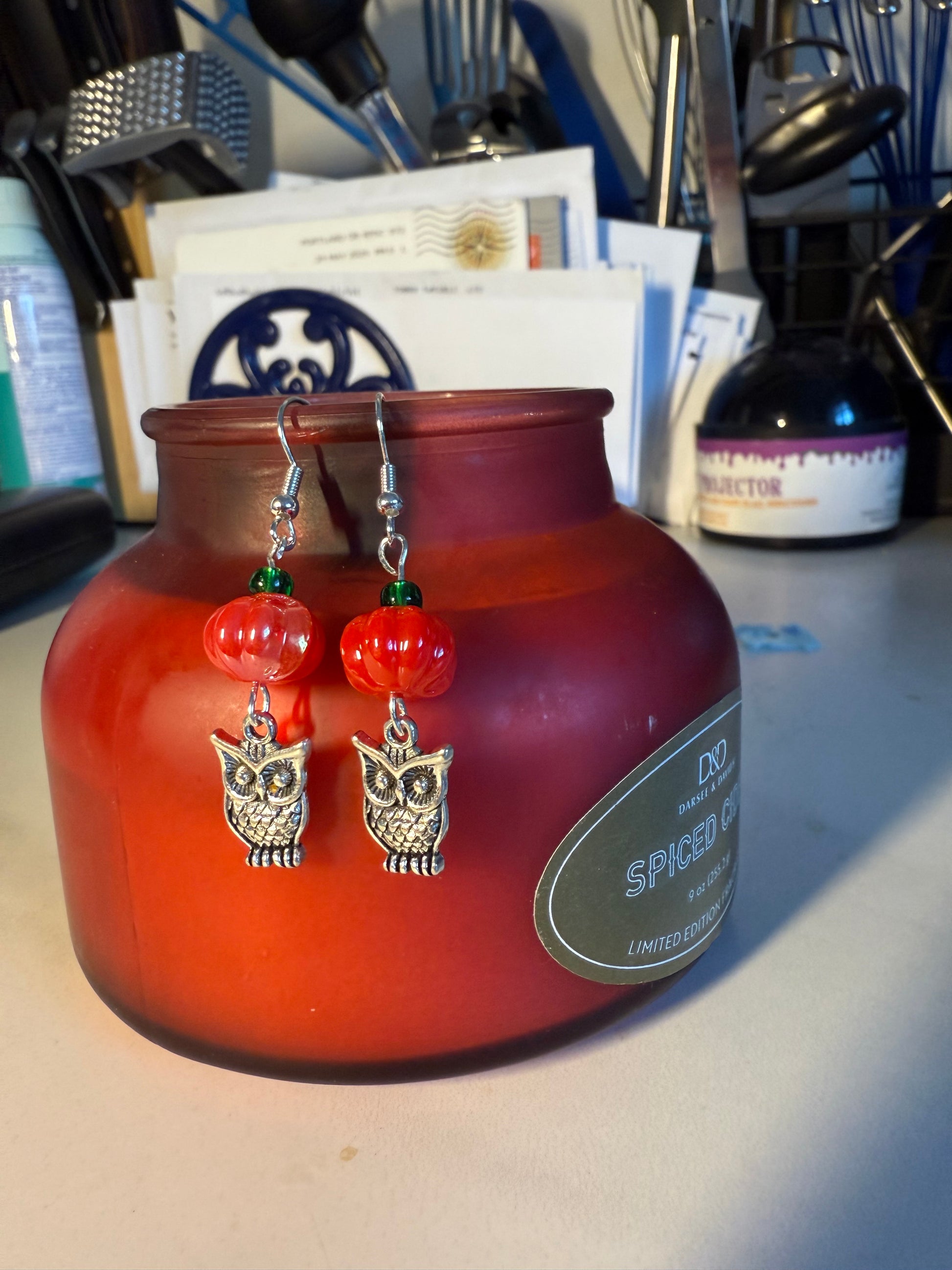 1” Handcrafted Halloween Earrings | Silver Owl Charm, Pumpkin Bead & Green Accent