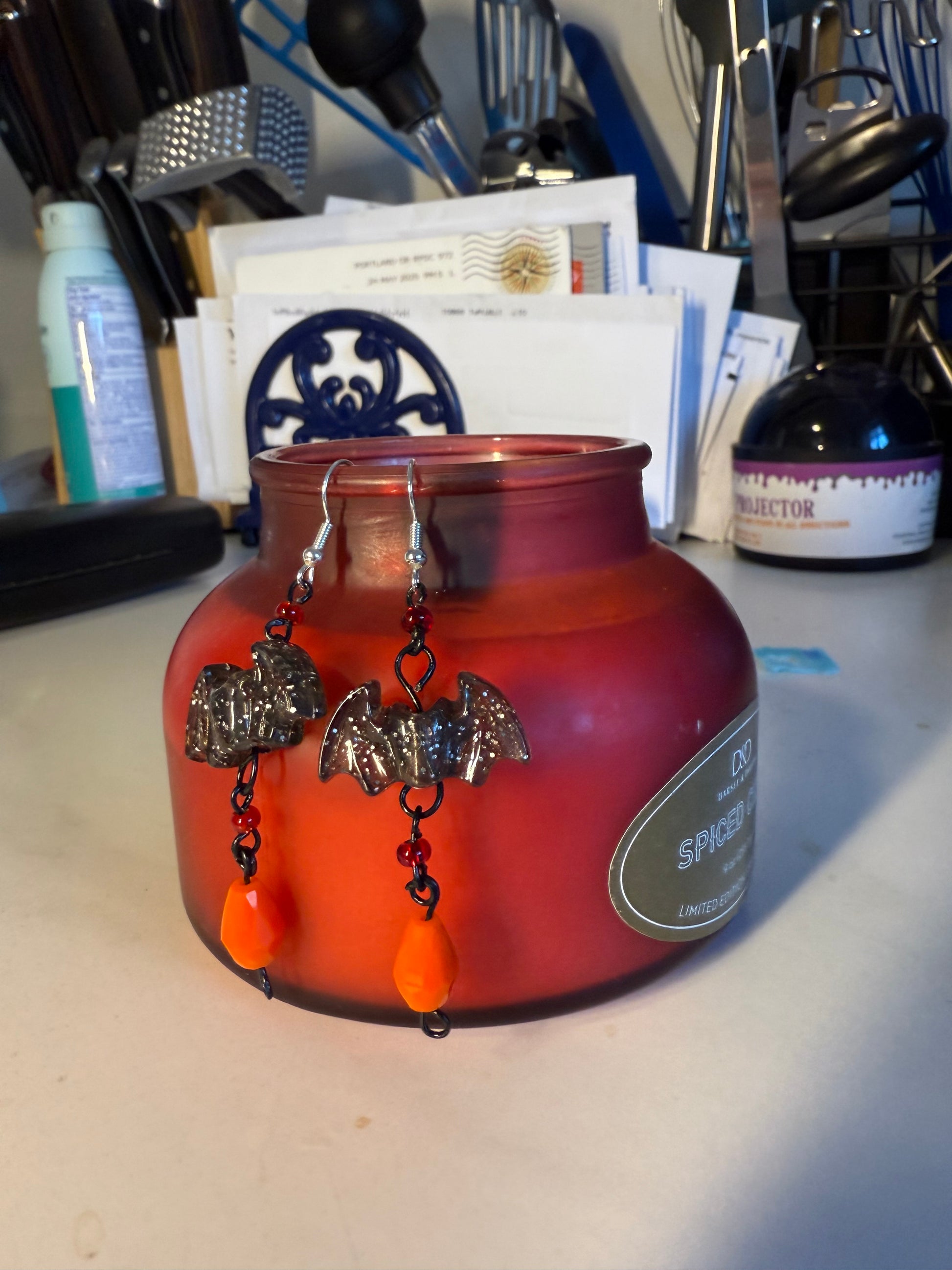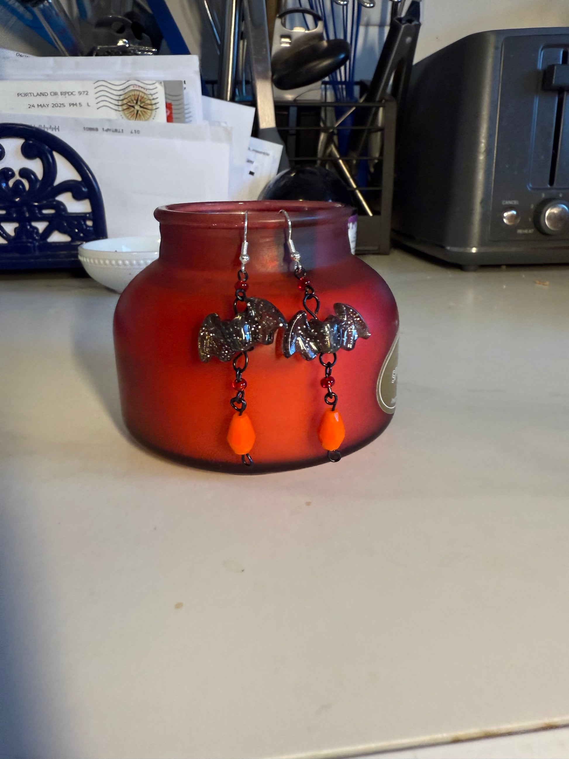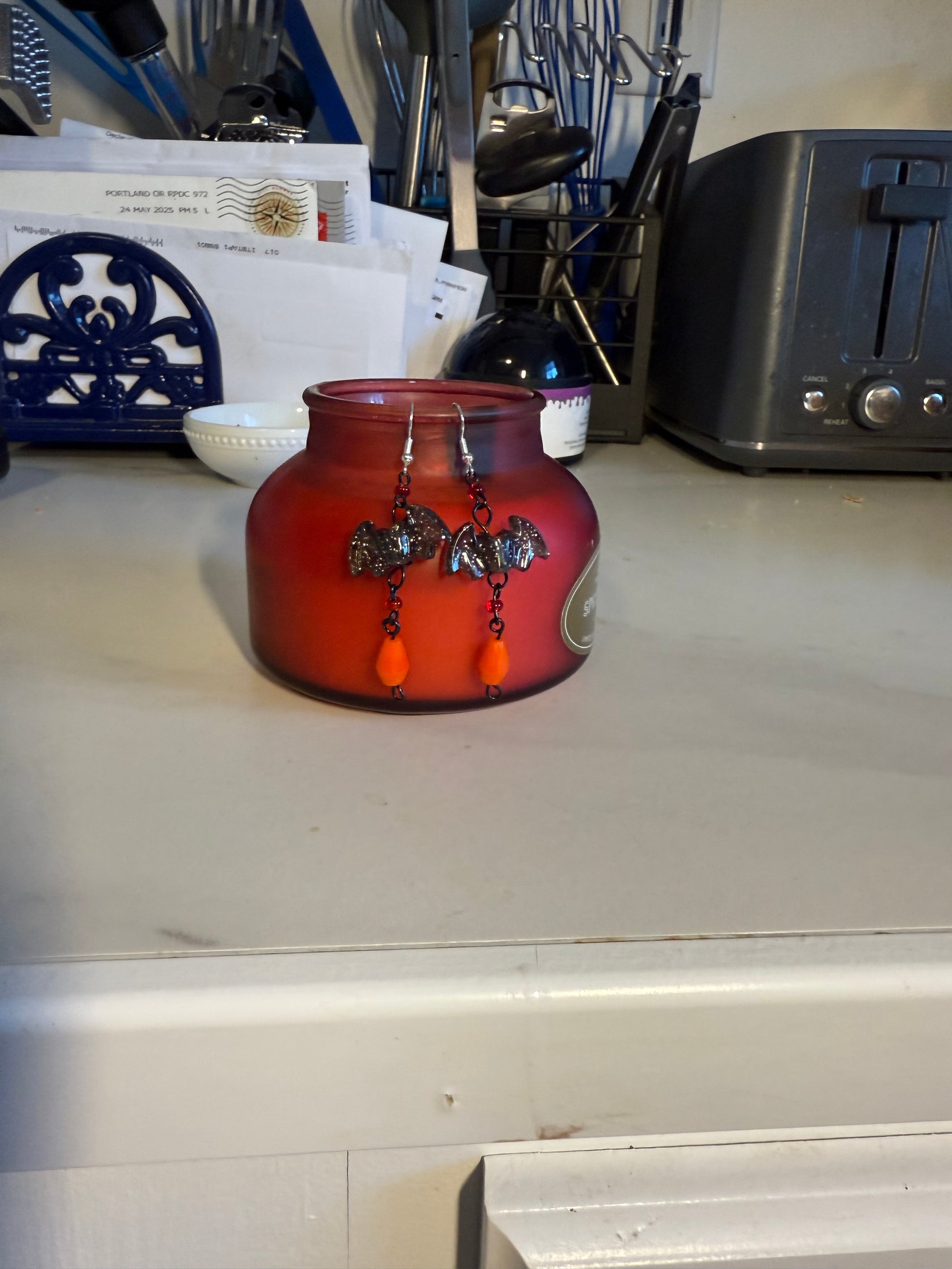 Add a touch of spooky sparkle to your Halloween look with these handcrafted 2” dangle earrings. Featuring silver earring hooks, they are adorned with a black sparkling bat bead, two small red beads, and an orange oblong bead at the bottom for a festive, eye-catching design.