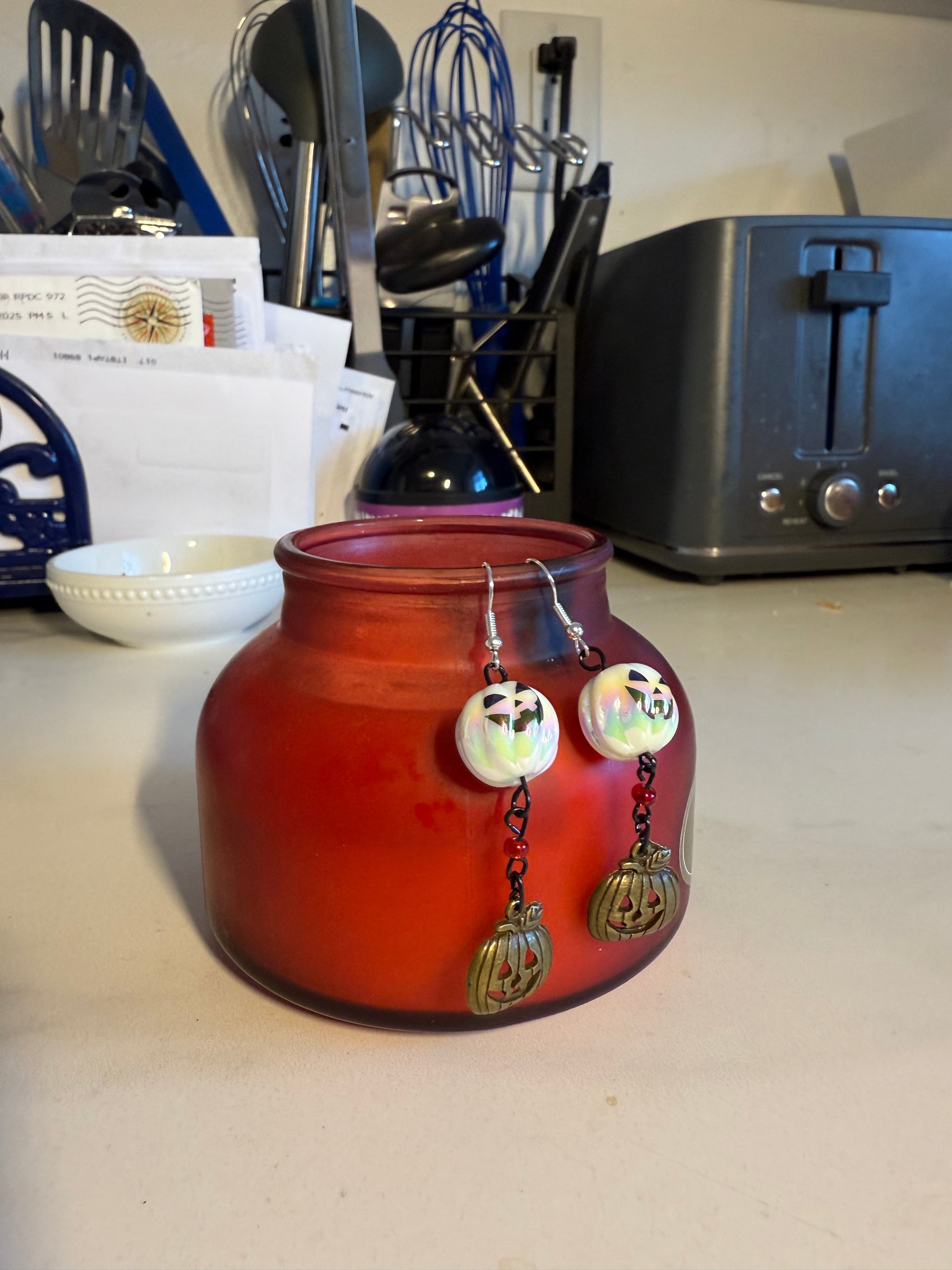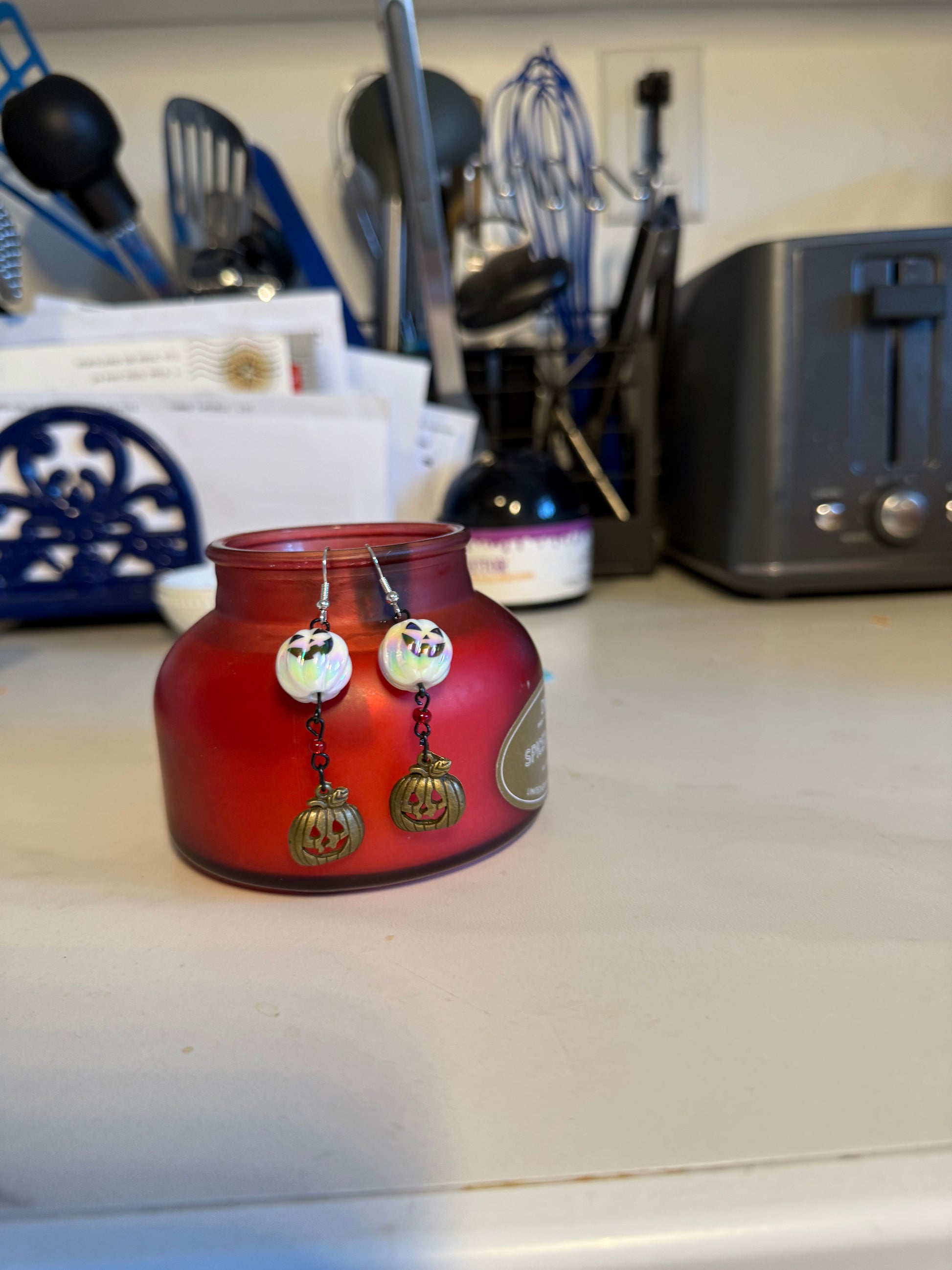 Celebrate spooky season in style with these handcrafted Halloween earrings. Featuring silver earring hooks, these 2” dangle earrings are adorned with a shiny white jack-o’-lantern charm, a small red bead, and a brass-toned flat charm, creating a playful and festive accessory.
