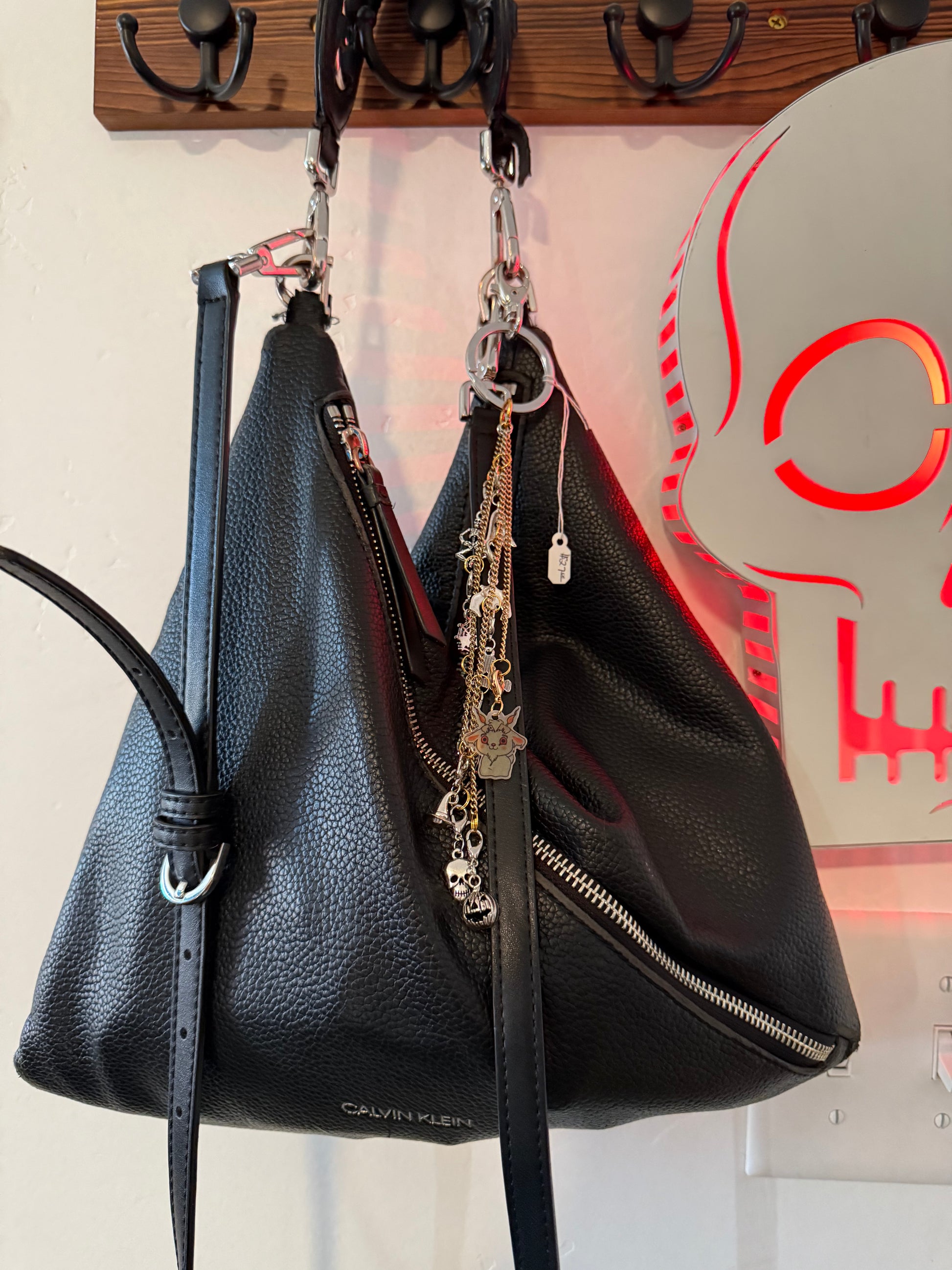Add a touch of spooky whimsy to your everyday accessories with this handcrafted multipurpose keychain. Featuring a silver round split ring with carabiner clasp and three thrifted chains, it’s adorned with a Lumieeehre resin charm and a collection of mostly thrifted charms, creating a playful, one-of-a-kind accessory.
