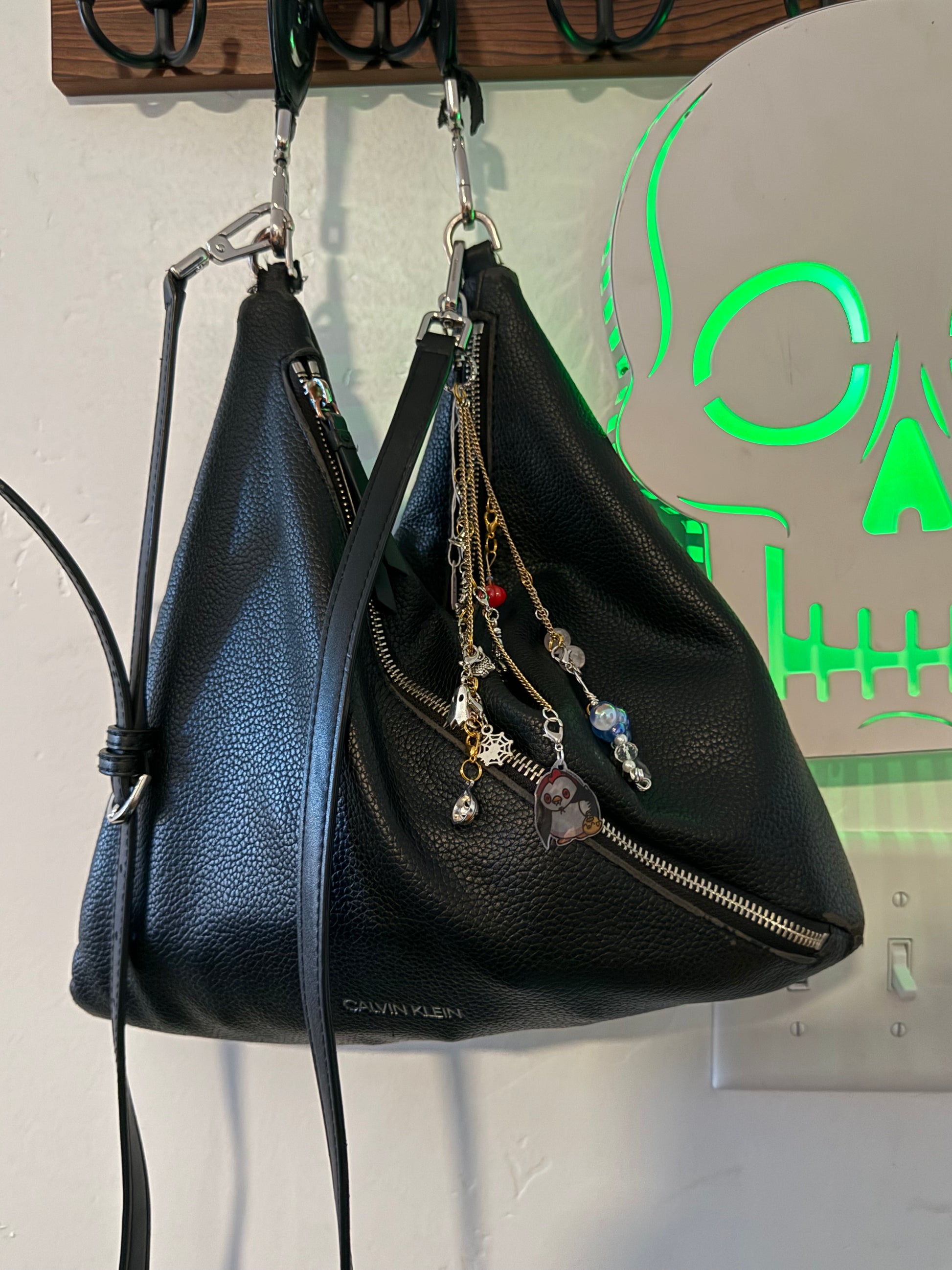 Add a spooky yet playful touch to your everyday accessories with this handcrafted multipurpose keychain. Featuring a silver heart split ring with carabiner clasp and three thrifted chains, it’s adorned with a Count Cluckula resin charm, handcrafted beaded charms, and thrifted accents, creating a whimsical, one-of-a-kind accessory.