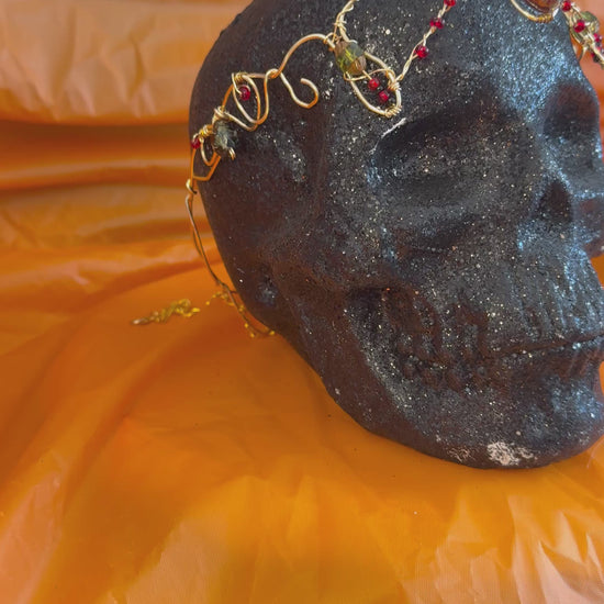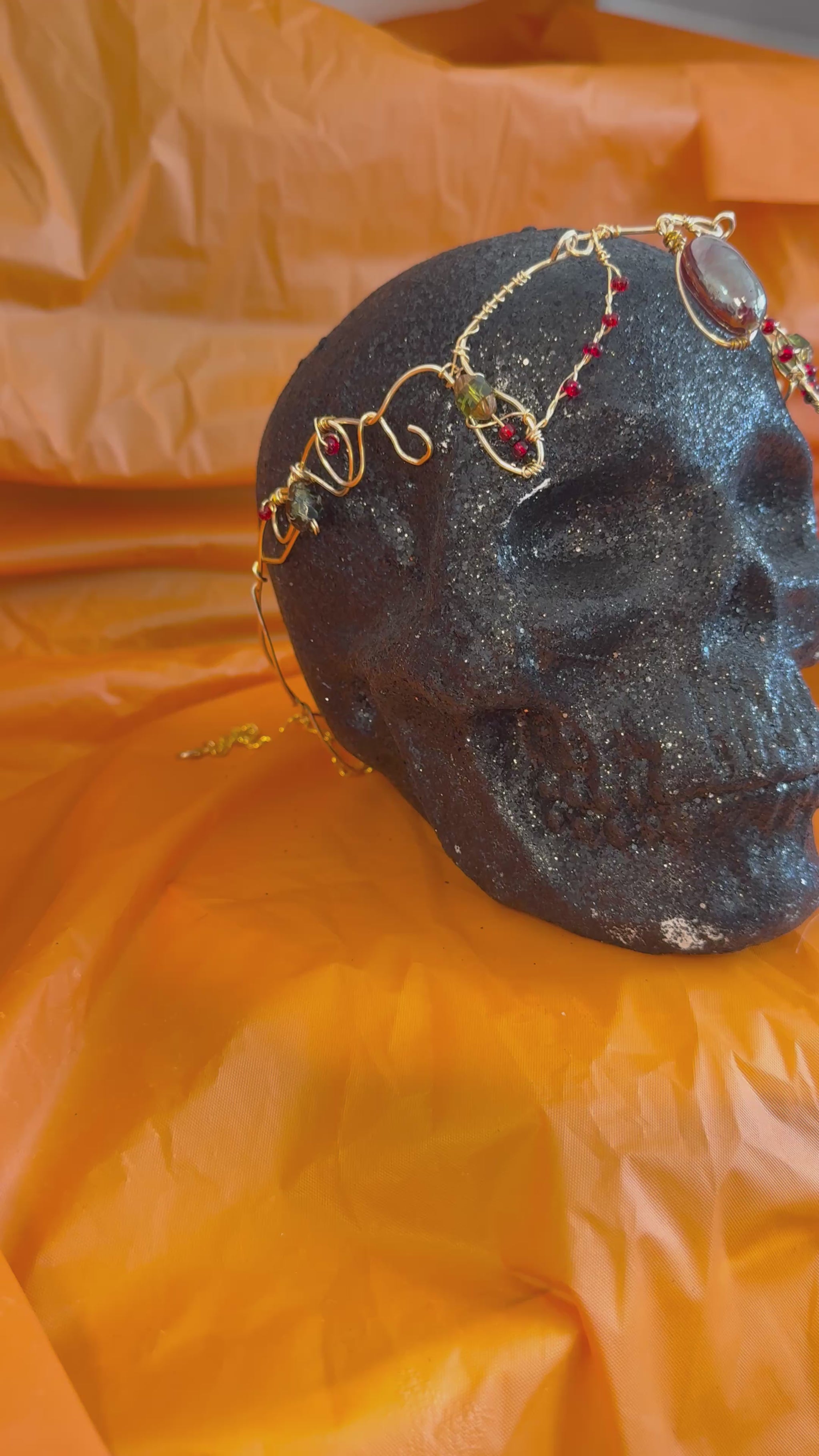 Radiate power and elegance with this gold elven-inspired crown, designed to capture true goddess energy. Handcrafted from gold-coated wire, it features a striking red oblong center stone surrounded by delicate red gemstone details, symbolizing passion, strength, and divine beauty.