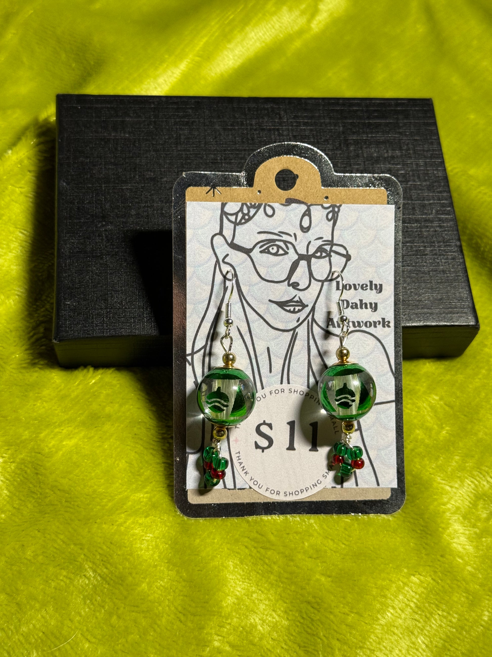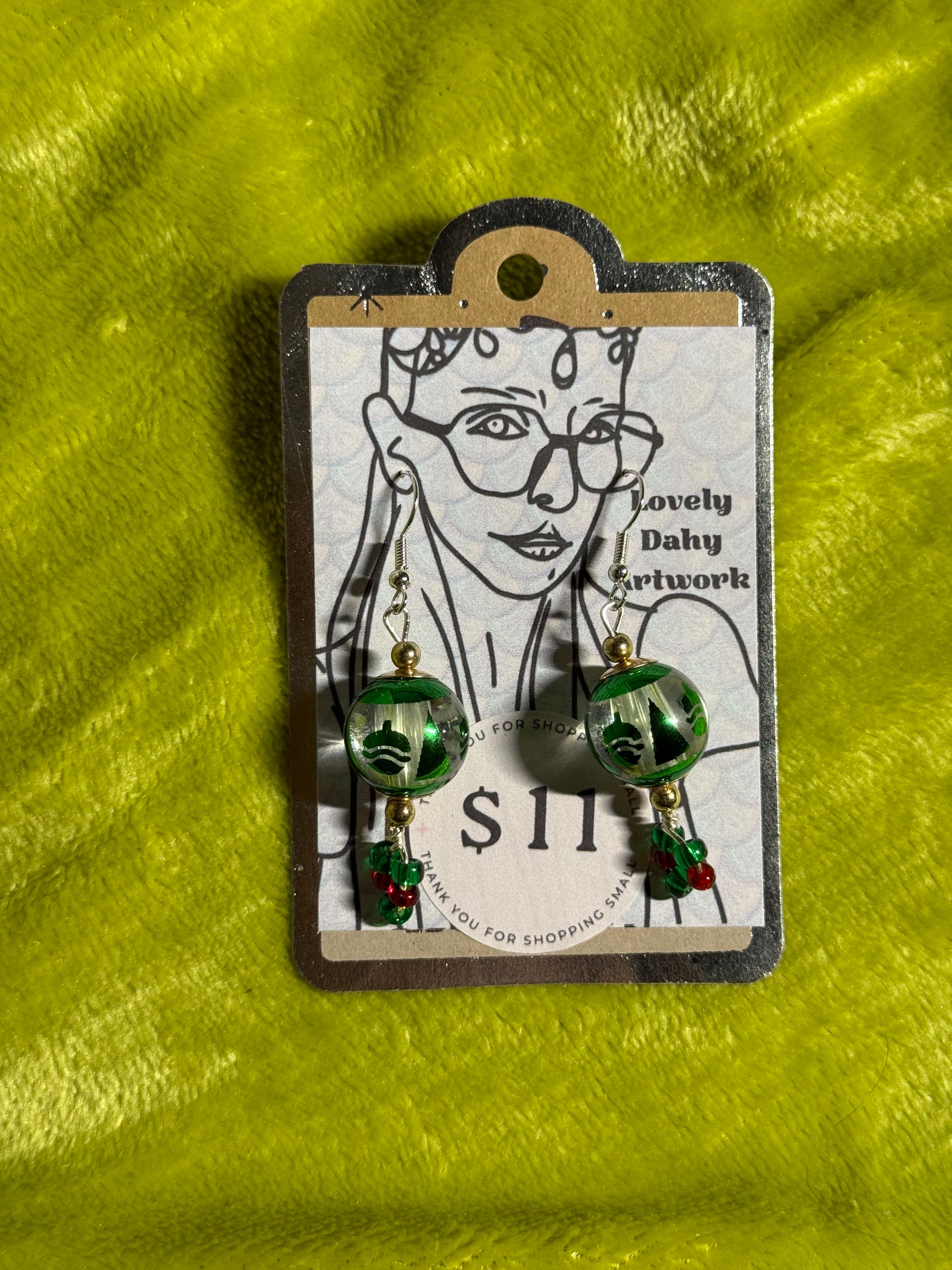 Green Tree & Pinecone Globe Earrings with Festive Beads — 2” Dangle