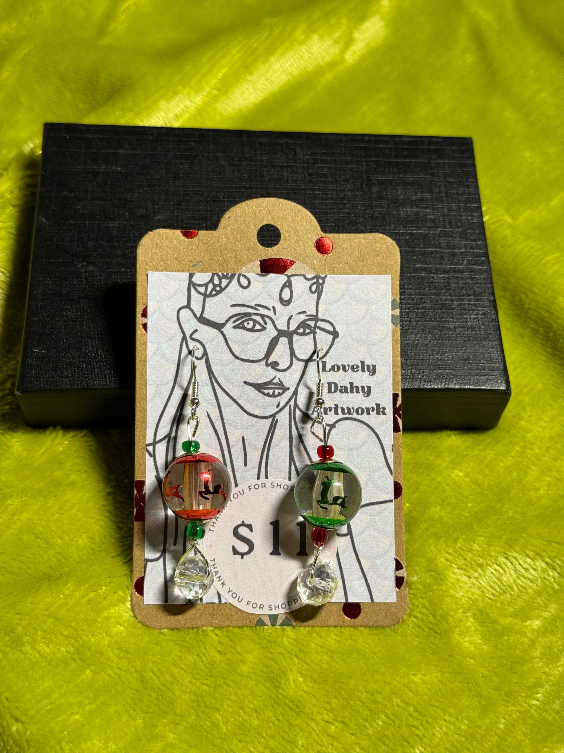 Celebrate the season with these whimsical 2” mismatched dangle earrings featuring one green globe and one red globe, each holding a tiny reindeer inside. Below each globe hangs a shimmering clear crystal bead, paired with red and green accent beads for the perfect festive touch. Finished with silver-plated ear hooks, they’re lightweight, charming, and made to stand out in any holiday look.