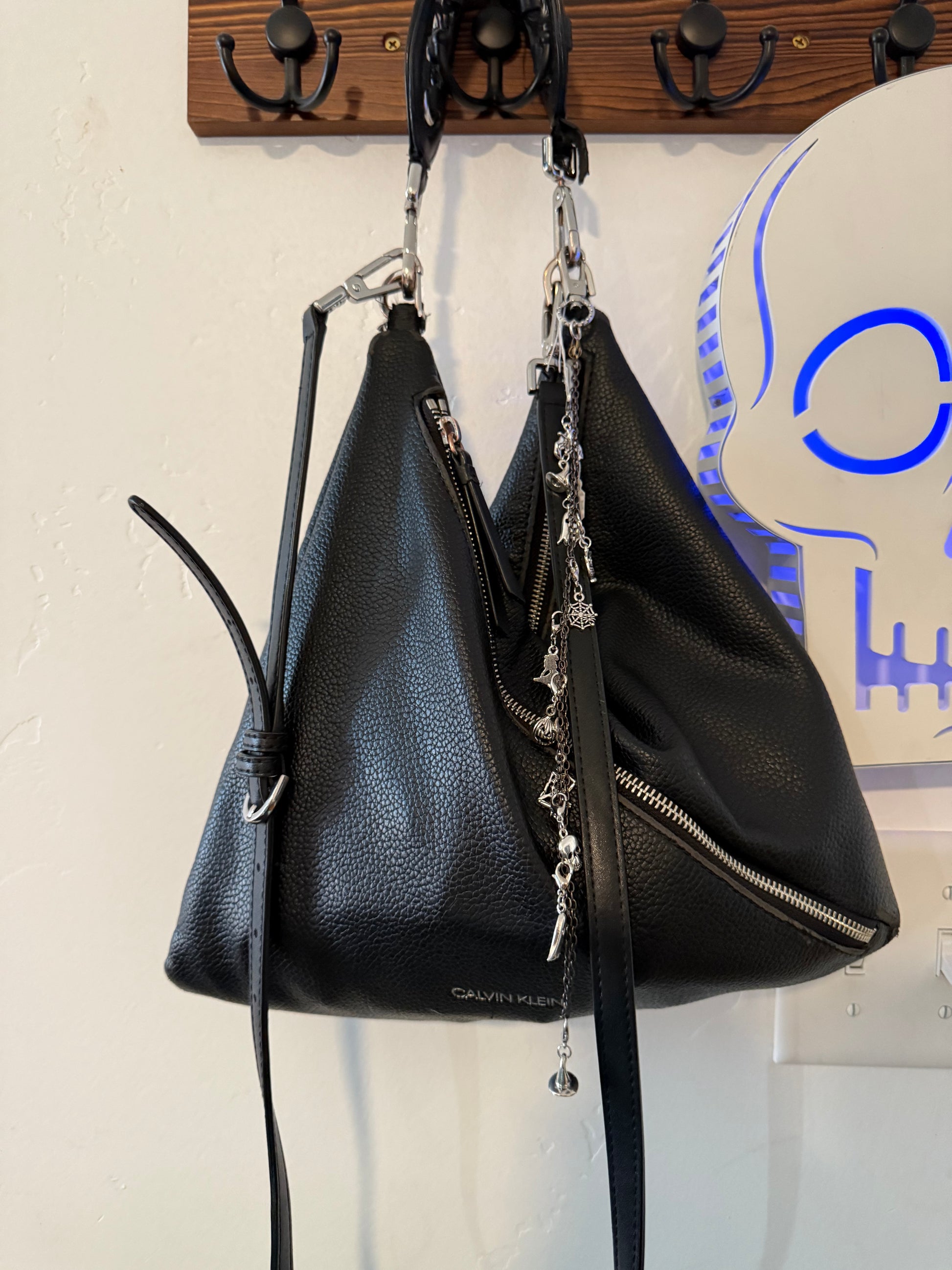 Bring vintage charm and versatility to your everyday look with this handcrafted, multipurpose chain. Featuring a silver carabiner clasp and a dark bronze thrifted chain, it’s adorned with a collection of thrifted charms, each with its own history and personality.