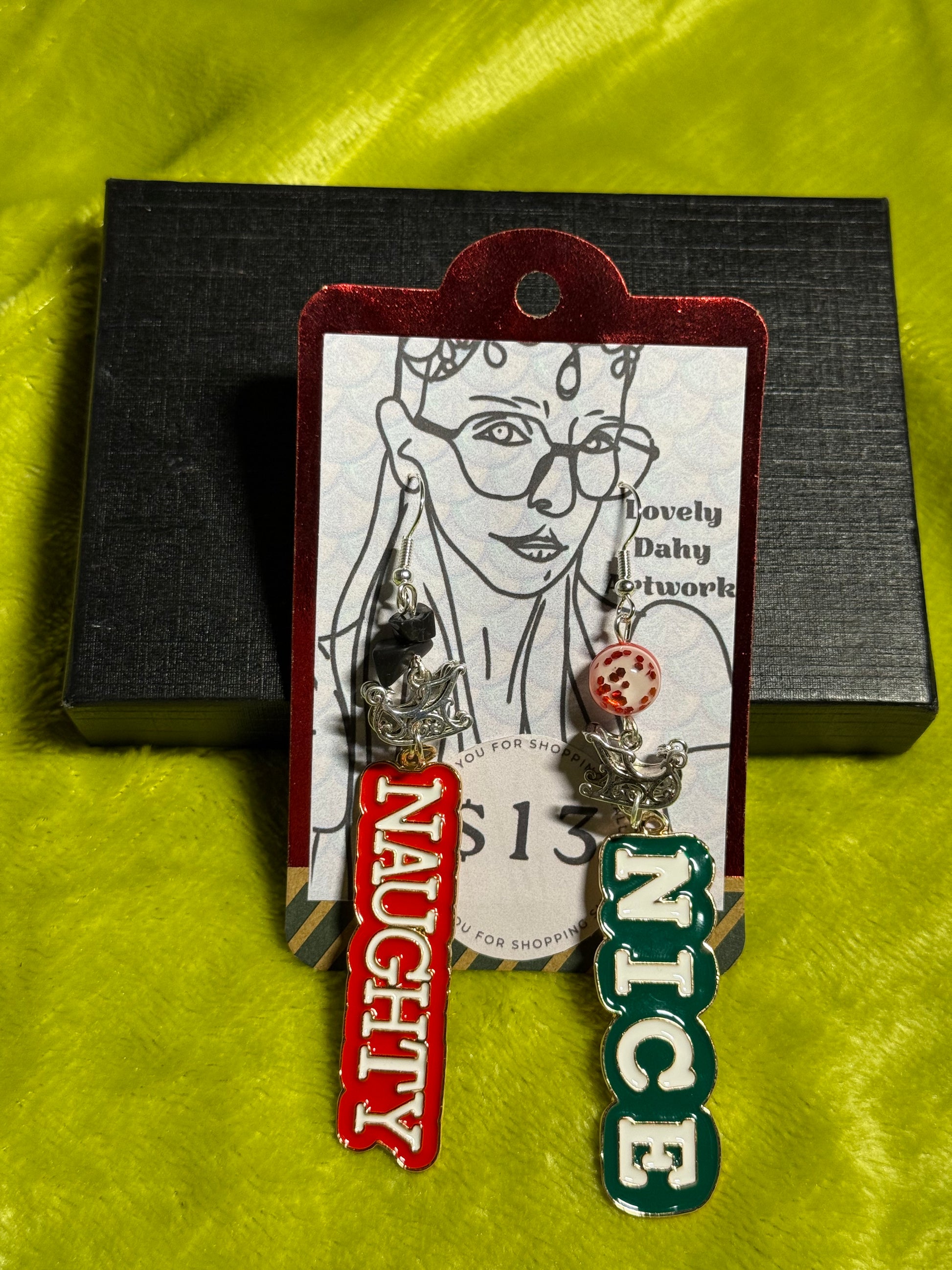 Playful and perfectly festive, these 2.5” dangle earrings feature a charming mismatched “Naughty or Nice” sleigh duo — one carrying a little bag of coal and the other filled with a tiny gift. Lightweight and full of holiday personality, each earring is finished with silver-plated ear hooks for comfortable all-day wear.