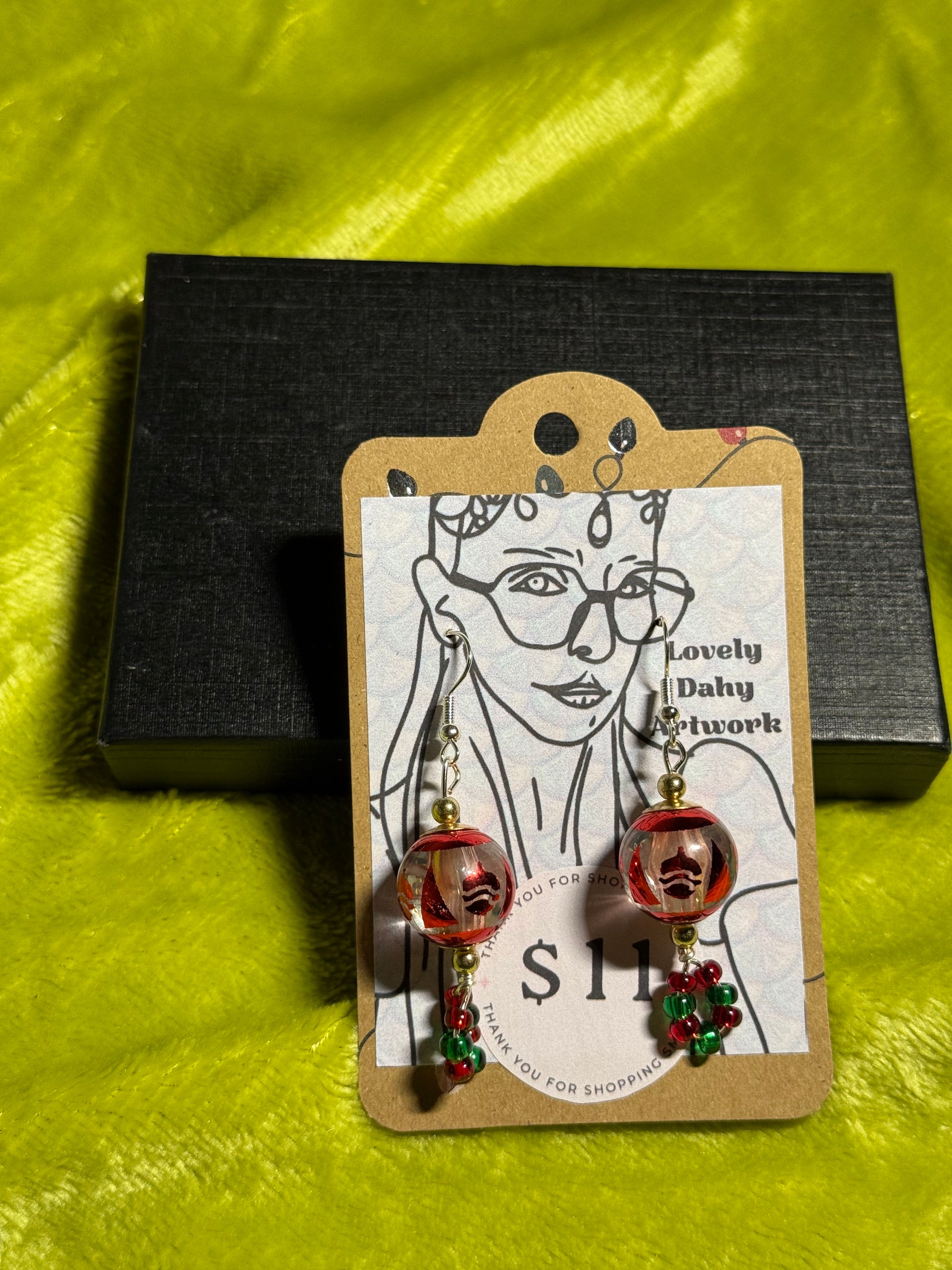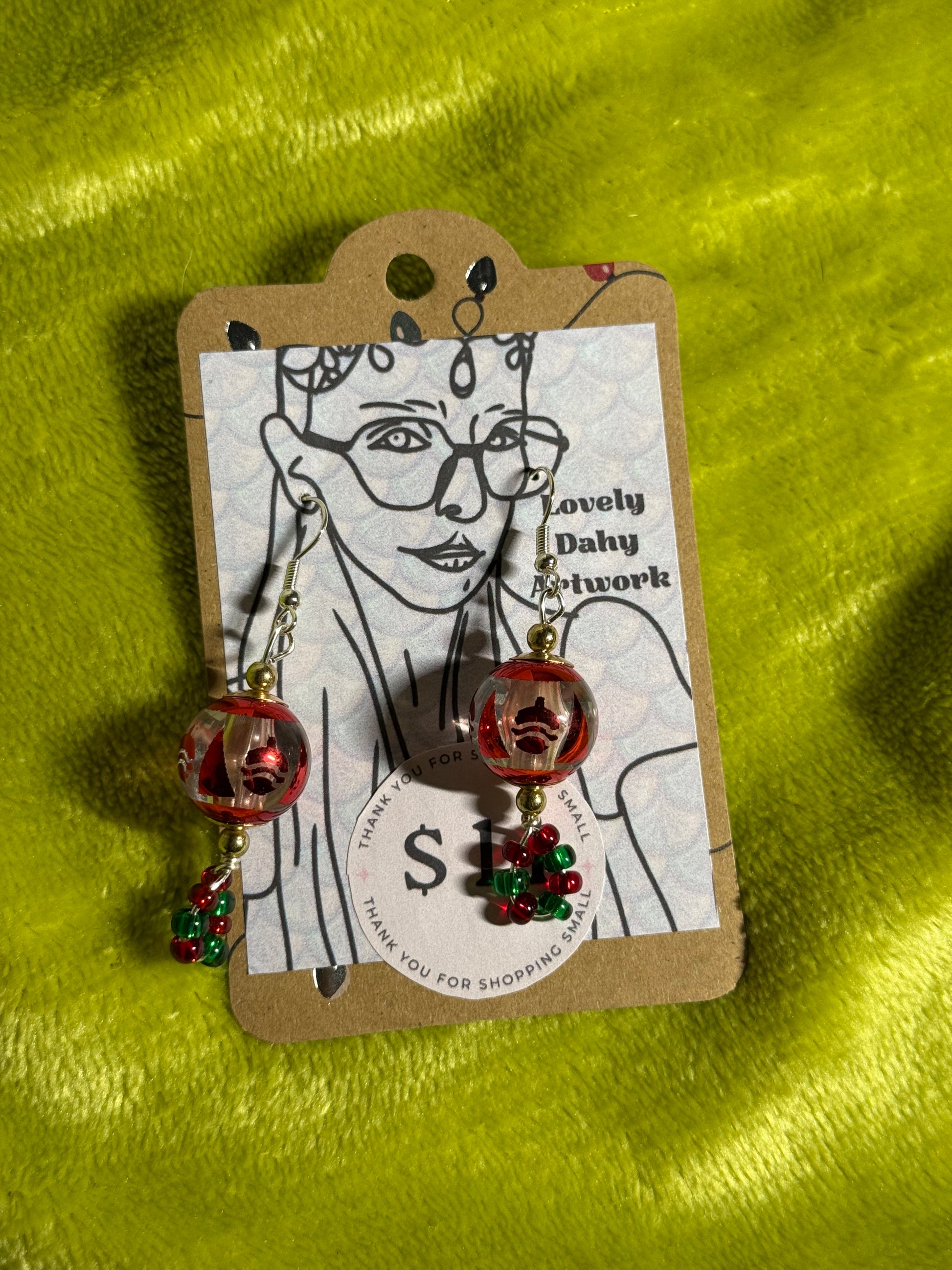 Red Tree Pinecone Globe Earrings with Festive Colored Beads —2” Dangle
