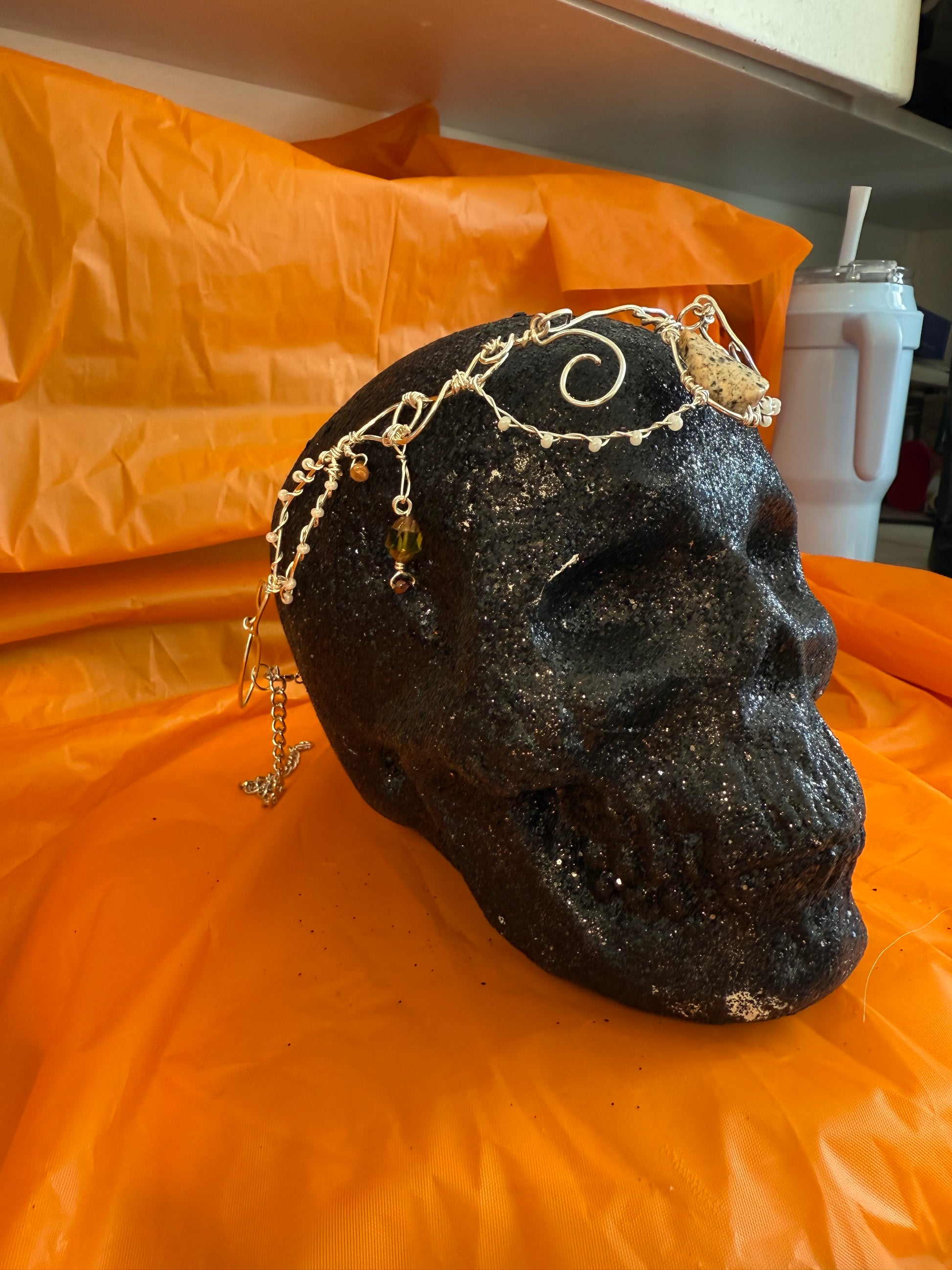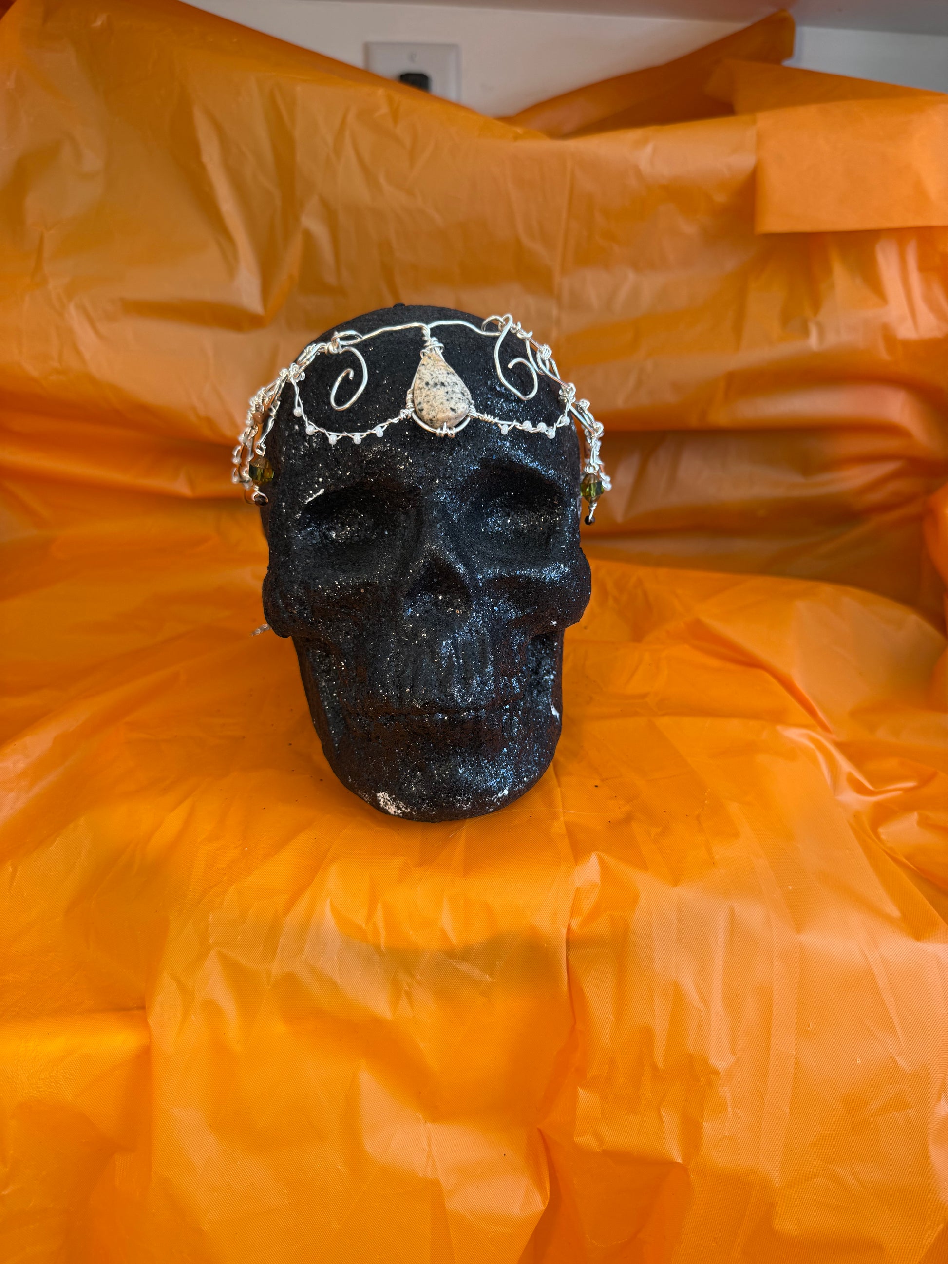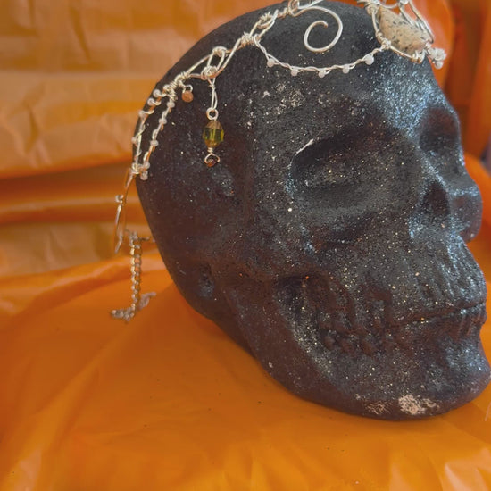 Graceful and regal, this silver elven crown channels the refined beauty of an elven court. Crafted from shimmering silver wire, its elegant lines frame a striking teardrop-shaped center stone, capturing the sophistication of timeless fantasy royalty.